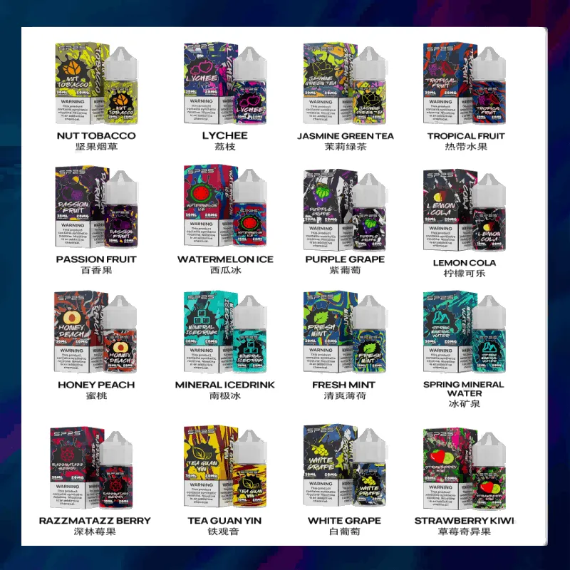 堅果煙草, 荔枝, 茉莉綠茶, 熱帶水果, 百香果, 西瓜冰, 紫葡萄, 檸檬可樂, 蜜桃, 南極冰, 清爽薄荷, 冰礦泉, 深林莓果, 鐵觀音, 白葡萄, 草莓奇異果